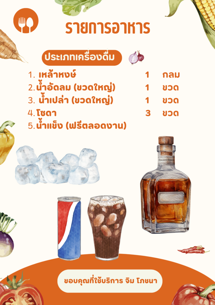 - เครื่องดื่มที่เสิร์ฟจะมีน้ำอัดลม 1 ขวด น้ำเปล่า 1 ขวด ต่อ 1 โต๊ะ