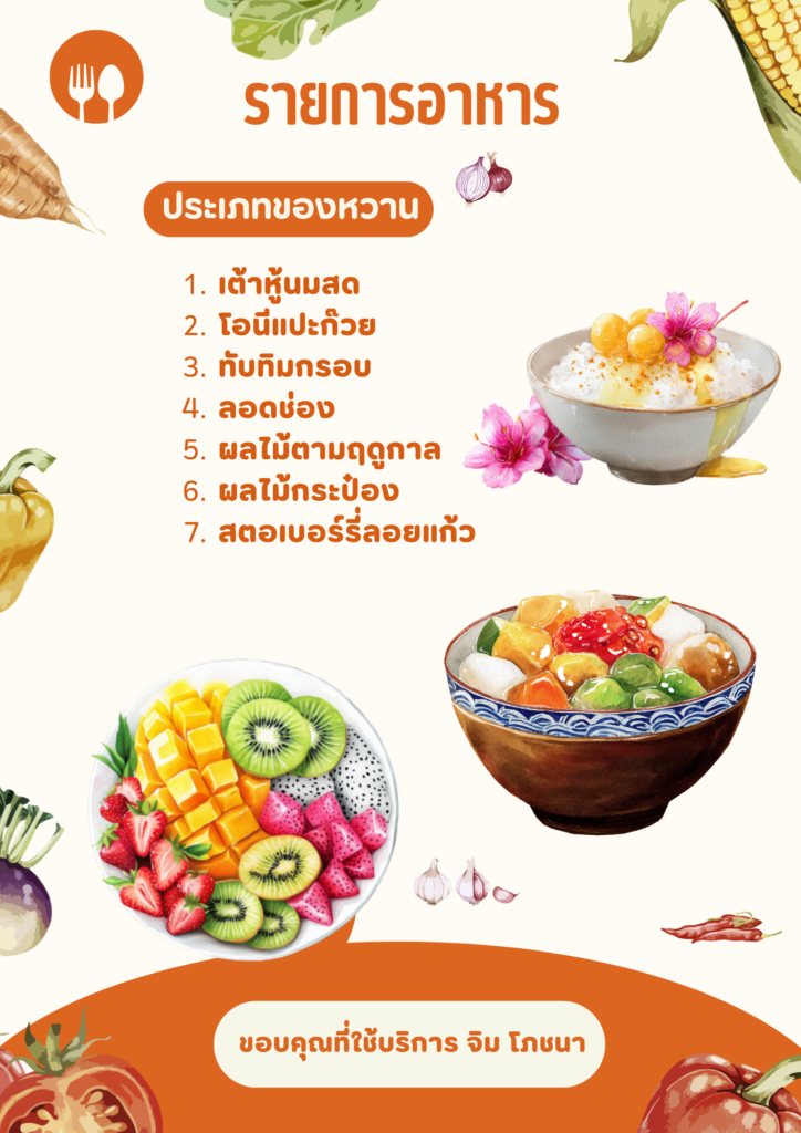 - สามารถเลือกเมนูอาหารได้ 7 อย่าง ของหวาน 1 อย่าง